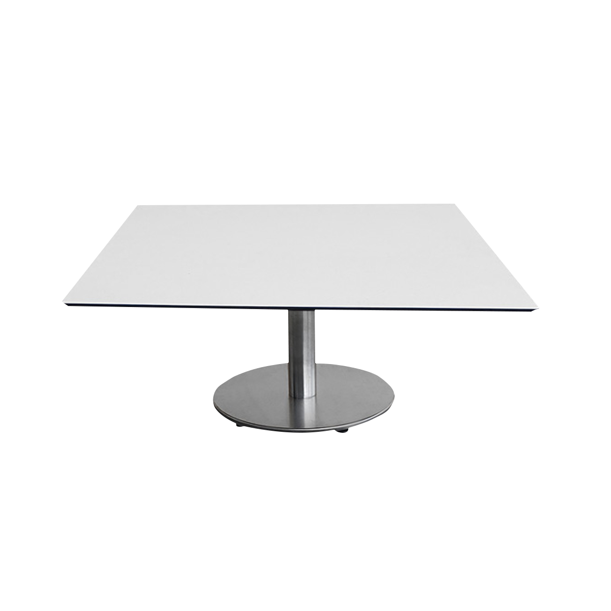 outdoorfähig, weiße beschichtete eckige Platte auf rundem Edelstahlfuß, höhenverstellbare Bodengleiter, BxTxH 80x80x35,5 cm