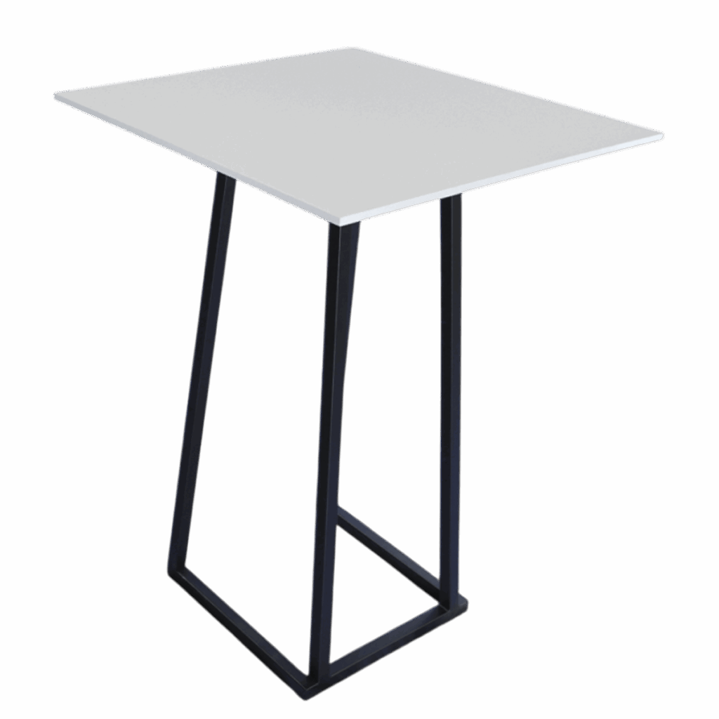 weiße HPL-Tischplatte 80x80cm, schwarzes Stapelgestell, Mietpreis ist exklusive Reinigung. Bei verschmutzter Rückgabe berechnen wir für einen evtl. anfallenden Reinigung, 15€/15min.